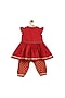Featuring a red angrakha kurta for girls in cotton silk chanderi base with an attached tassels belt and ruffles sleeves, including lace and gota-patti hand embroidery. It is paired with cotton salwar pants having gold foil print, including a swaddle, booties, mittens, and a cap. Style this outfit with a pair of sandals and a cute hair accessory for any festive occasion.