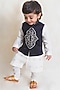 Featuring a black bundi jacket in cotton base with thread embroidery. It is paired with contrasting white pants and a kurta.