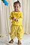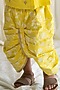 Featuring a yellow kurta in cotton satin base with subtle boota embroidery. It is paired with matching cotton slub dhoti pants having floral print and an elasticated waistband.