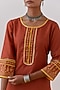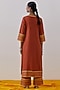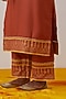 Featuring a rust kurta in slub cotton base with hand block print and gota trim details. It is paired with palazzo pants. Style it with dangler earrings and heels for a festive occasion.