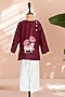Featuring a maroon kurta for boys in tissue and cotton base with nandi motif hand embroidery and side button detailing. It is paired with white straight pants. Accentuate it with traditional mojaris and a cute watch for a stylish ensemble, ideal for family functions, festive occasions or pooja ceremonies.