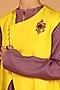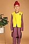 Featuring a yellow nehru jacket for boys in mul chanderi base with embroidery. It is paired with a purple kurta and pants. Style it with juttis and a watch for a festive occasion or wedding ceremony.