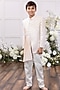 Featuring an ivory sherwani for boys in silk base with embroidery. It is paired with trousers. Style it with a watch and pair of mojris for a wedding, sangeet or engagement ceremony.