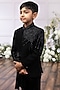 Featuring a jet black sherwani for boys in silk base with beadwork. It is paired with pants. Style it with a watch and pair of mojris for a wedding, sangeet or engagement ceremony.