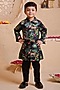 Featuring a black kurta for boys in modal satin base with print. It is paired with trousers. Accessorize this set with mojris and a watch for a stylish ensemble, ideal for ceremonial events or any festive occasion.