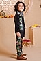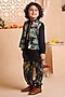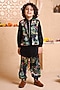 Featuring a black nehru jacket for boys in modal satin base with print. It is paired with a printed kurta and cotton silk trousers. Style it with juttis and a watch for a festive occasion or wedding ceremony.