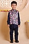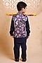 Featuring a navy blue nehru jacket for boys in modal satin base with print. It is paired with a printed kurta and cotton silk trousers. Style it with juttis and a watch for a festive occasion or wedding ceremony.