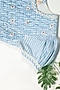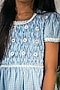 Featuring a blue frock in cotton base with floral embroidered crochet, hand smocking and crochet lace.