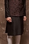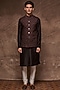 Featuring a brown bundi jacket in linen base with beige jaal embroidery. This contains only one piece.