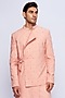 Featuring a dusty pink asymmetric indowestern jacket in organic cotton base with motifs detailing. It is paired with a matching organic cotton asymmetrical toned kurta and terry rayon fitted pants. Perfect wear for a festive or wedding ceremony.