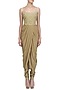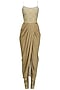 This set features a gold drape kurta in chanderi silk base with pleated georgette drape hand embroidered with rose gold dori, dabka and faux basra pearls on the yoke. It is paired with gold pleated dupion silk churidaar pants.
