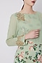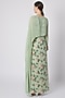 Featuring a mint green draped dress in crepe and georgette base with aari work embroidery. It has floral print and a panel on the shoulders.