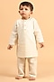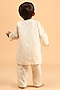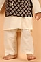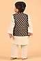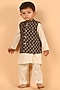 Featuring a black nehru jacket for boys in cotton base with mandarin collar and ajrakh print. It is paired with a contrasting off-white kurta and pyjama pants having an elasticated waistband. Perfect wear for any festive occasions.