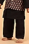 Featuring a black nehru jacket for boys in cotton base with a mandarin collar and ajrakh print. It is paired with a matching kurta and pyjama pants having an elasticated waistband. Perfect wear for any festive occasion.