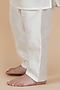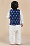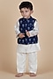 Featuring an indigo blue nehru jacket for boys in cotton base with print, pockets and a mandarin collar. It is paired with an off-white chanderi kurta and pyjama pants. Perfect wear for any festive occasion.