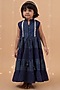 Featuring an indigo blue checkered flared dress for girls in cotton slub base with hand block print and a mandarin collar, including gota lace, zari hand detailing and tassel drawstring. Style it with a headband and sandals to amplify your look. Perfect wear for any festive occasion.