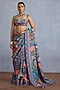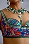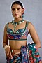 Torani presents a blue and green bralette in chanderi and butterfly net base hand embroidery. Style it with a saree, statement earrings, embroidered kolhapuri heels and a sleek clutch for festive gatherings or wedding functions.