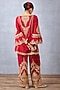 Featuring a bright red short kurta in slub silk base with bell sleeves, dori and hand embroidery. It is paired with matching wide-legged pants and a butterfly net dupatta having dori embroidery.