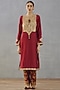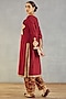 Featuring a burgundy kurta in handwoven chanderi base with mirror embroidery. It is paired with matching cotton silk salwar pants having chintz print and a silk organza dupatta.