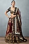 Featuring a burgundy lehenga in heavy raw silk base with bhagalpuri digital print, hand adda work and gota embroidery. It is paired with a matching blouse and a printed pure silk organza dupatta.