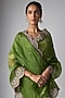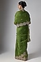 Featuring a green saree in organza base. Accentuate it with a blouse, silver or swarovski jewellery, block heels and an embellished clutch for a sangeet, wedding or mehendi ceremony.