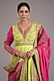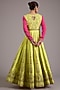 Featuring a lime green anarkali in muslin silk, jeni silk and chinon georgette base with pearl, zari and dori embellishments. It is paired with churidar pants and a pink dupatta. Accentuate it with polki stud earrings, a soft braided hairstyle and juttis for a timeless festive look or mehendi ceremony.
