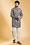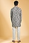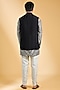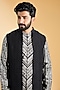 Featuring a black bundi jacket in jeni silk base with floral motifs and chevron print. It is paired with a kurta and pants. Style it with kolhapuri sandals for a festive occasion, sangeet or engagement wear.
