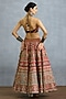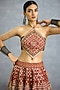 Torani presents a multi-colored lehenga in jeni silk base with patola print and mirror hand embroidery. It is paired with a halter-neck blouse. Style this lehenga set with kundan polki jewellery, block heels and a clutch for a wedding, sangeet or engagement ceremonies.