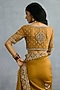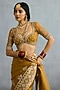 TORANI presents an ochre saree in butterfly net and organza base with embroidery. Style it with a sleek low bun, adorned with fresh gajra, and a embellished potli bag for an elegant festive look.