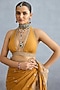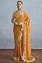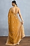 TORANI presents an ochre saree in georgette, muslin silk and jeni silk base with embroidery. It is paired with a blouse and a jacket. Accentuate the designer saree with statement jewellery and heels for your wedding, haldi or engagement ceremony.