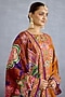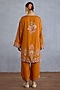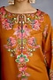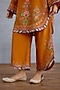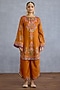 Torani presents an orange and purple kurta in dola silk base with chintz digital print. It is paired with pants and a dupatta. Own the spotlight in block heels and dangler earrings that amplify your look, perfect for festive ceremonies.