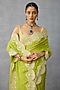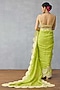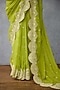 Torani features a mesmerizing parrot green saree in organza base with scalloped border and embroidery. Style it with an embellished blouse, statement earrings and heels for a striking festive or sangeet look.