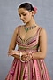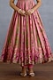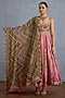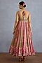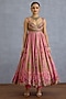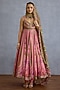 Torani presents a pink anarkali in silk crepe organza, cotton silk and jeni silk base with digital print, including hand motifs and sequins work. It is paired with churidar and a dupatta. Own the spotlight in block heels and dangler earrings that amplify your look, perfect for sangeet ceremonies.