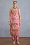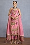 Torani presents a pink kurta in silk crepe organza, soft linen fabric and jeni silk base with floral motifs detail and kalamkari print. It is paired with pants and a dupatta. Own the spotlight in block heels and dangler earrings that amplify your look, perfect for festive ceremonies.