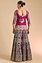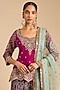 Featuring a pink-purple kurta in jeni silk and butterfly net base. It is paired with sharara pants and a dupatta. Accentuate it with statement earrings and heels for a festive occasion, sangeet, wedding or engagement ceremony.