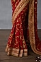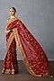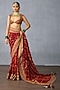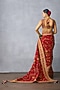 TORANI presents a red saree in jeni silk and organza base with embroidery. Style it with a sleek low bun, adorned with fresh gajra, and a embellished potli bag for an elegant festive look.