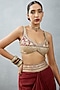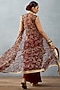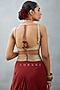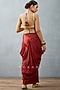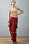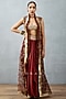 Featuring a red cape in slub silk base with bhagalpuri print, hand adda and gota embroidery. It is paired with a matching bralette and dhoti pants.