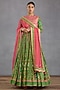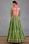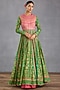 Featuring a rich green anarkali in slub silk and silk organza base with churidar sleeves, hand adda work and gota embroidery, including digital bhagalpuri print. It is paired with a contrasting dupatta.