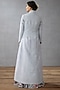 Featuring a sea blue long jacket in cotton silk and cotton voile base with dori machine embroidery. It is paired with a matching handwoven chanderi crushed maxi dress having digital print. Accentuate it with statement earrings and heels for a festive look.