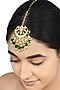 Featuring a gold plated maang tikka studded with green glass beads and pearls, set in silver.