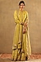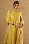 Featuring a celery green kurta in handwoven pure katan silk base with hand embroidery. It is paired with matching pure metallic silk cotton sharara pants and a dupatta.