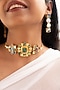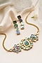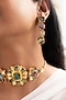 Featuring a holographic choker necklace studded with multi-colored mother of pearls, set in copper. It is paired with a matching pair of earrings. This necklace set is ideal for a festive occasion or wedding ceremony.