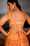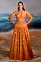 Featuring a peach lehenga in silk velvet base with beads and stone embellishments. It is paired with a raw silk embellished blouse and a tulle dupatta. Accentuate it with zircon jewellery and heels for a wedding, sangeet or engagement ceremony.