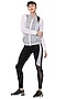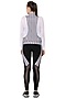 Featuring a white jacket in poly cotton lycra base with abstract print and zip detailing. It is paired with contrasting black leggings.