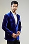 Featuring a blue blazer in velvet base with a notched lapel detail and metal buttons. Style it with a shirt and pants for formal events.