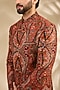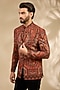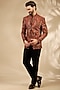 Featuring a rust bandhgala in viscose and polywool base with thread embroidery. It is paired with trousers. Style it with a pair of mojaris for a reception, wedding, sangeet or engagement ceremony.