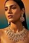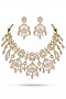 Featuring a micro gold finish necklace studded with kundan polki and pearls, set in brass. It is paired with a matching pair of earrings. Ideal for festive occasions, weddings, or elevating your elegant evening look.
