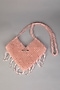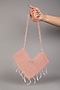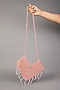 Featuring a pink heart-shaped clutch studded with crystals and crystal bead fringes. It has a woven crystal belt. Carry it as a statement piece with an evening gown or traditional attire for weddings, events, gala nights, or festive celebrations.