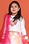 Featuring a pink and orange tie-dye lehenga for girls in organza base with an elasticated back, embroidered hangings and strings detail. It is paired with a white silk top having mirror work and a dupatta. Style it with sandals and hair accessories for a wedding or festive occasion.