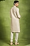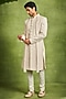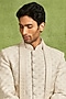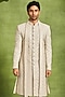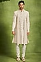 Featuring a beige sherwani in art silk base with bead, stone work and thread embroidery. It is paired with churidar and a dupatta. Style it with pair of mojaris for a wedding or engagement ceremony.